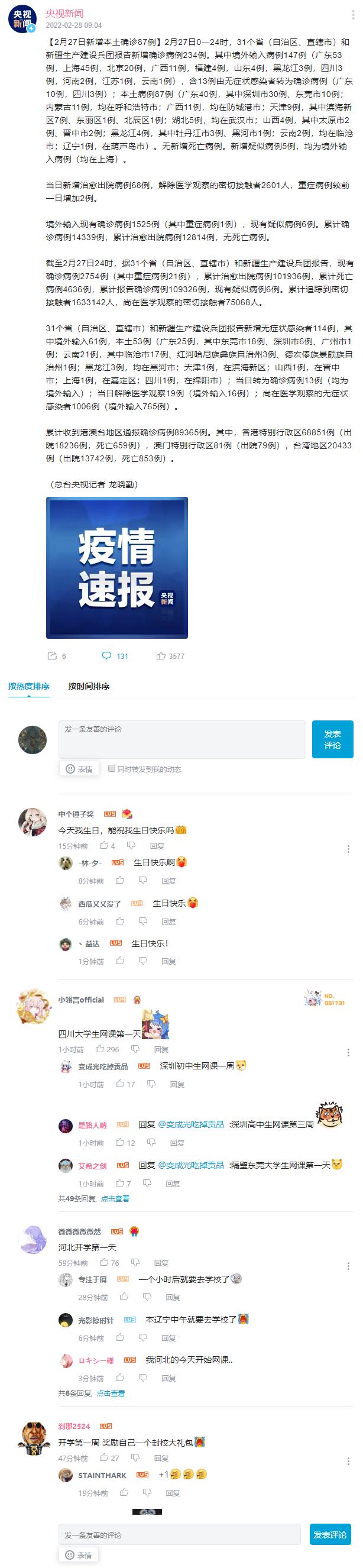 【2月27日新增本土确诊87例】2月27日0—24时,31个省(自治区、直辖市)和新疆生产建设兵团报告新增确诊病例234例。其中境外输入病例147例(广东53例,上海45例,北京20例,广西11例,福建4例,山东4例,黑龙江3例,四川3例,河南2例,江苏1例,云南1例),含13例由无症状感染者转为确诊病例(广东10例,四川3例);本土病例87例(广东40例,其中深圳市30例、东莞市10例;内蒙古11例,均在呼和浩特市;广西11例,均在防城港市;天津9例,其中滨海新区7例、东丽区1例、北辰区1例;湖北5例,均在武汉市;山西4例,其中太原市2例、晋中市2例;黑龙江4例,其中牡丹江市3例、黑河市1例;云南2例,均在临沧市;辽宁1例,在葫芦岛市)。无新增死亡病例。新增疑似病例5例,均为境外输入病例(均在上海)。