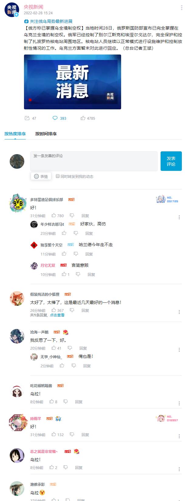 【俄方称已掌握乌全境制空权】当地时间28日,俄罗斯国防部宣布已完全掌握在乌克兰全境的制空权。俄军已经控制了别尔江斯克和埃涅尔戈达尔,完全保护和控制了扎波罗热核电站周围地区。核电站人员继续以正常模式进行设施维护和控制放射性情况的工作。乌克兰方面暂未对此进行回应。(总台记者王斌)