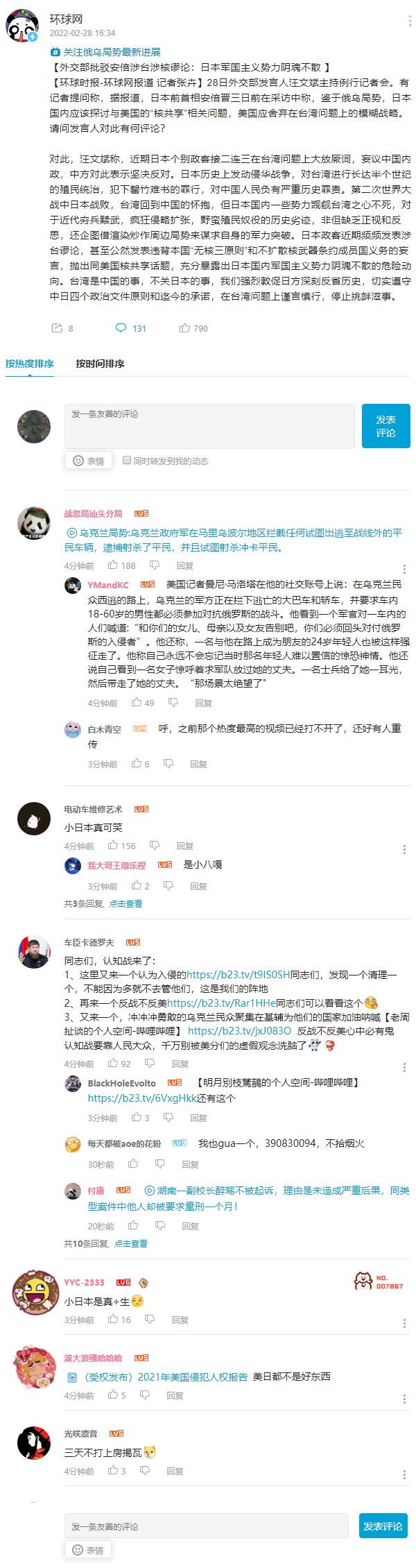 【环球时报-环球网报道 记者张卉】28日外交部发言人汪文斌主持例行记者会。有记者提问称,据报道,日本前首相安倍晋三日前在采访中称,鉴于俄乌局势,日本国内应该探讨与美国的“核共享”相关问题,美国应舍弃在台湾问题上的模糊战略。请问发言人对此有何评论?