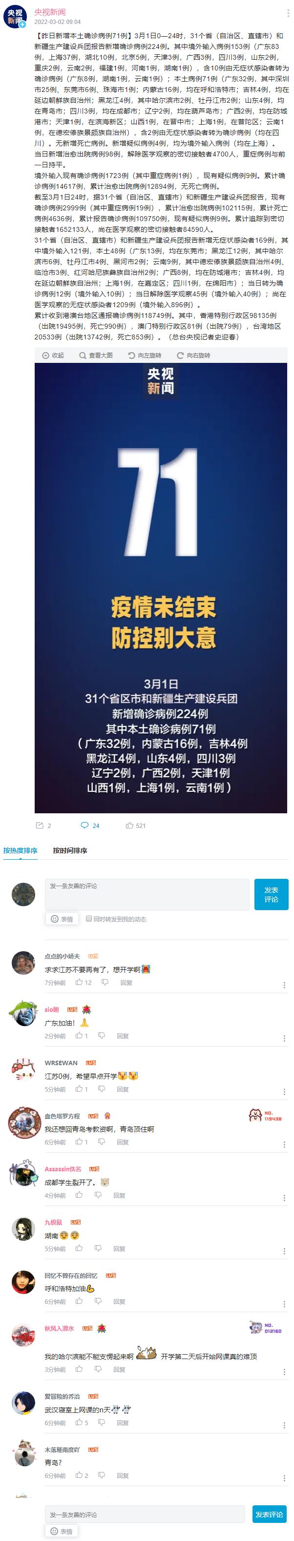 【昨日新增本土确诊病例71例】3月1日0—24时,31个省(自治区、直辖市)和新疆生产建设兵团报告新增确诊病例224例。其中境外输入病例153例(广东83例,上海37例,湖北10例,北京5例,天津3例,广西3例,四川3例,山东2例,重庆2例,云南2例,福建1例,河南1例,湖南1例),含10例由无症状感染者转为确诊病例(广东8例,湖南1例,云南1例);本土病例71例(广东32例,其中深圳市25例、东莞市6例、珠海市1例;内蒙古16例,均在呼和浩特市;吉林4例,均在延边朝鲜族自治州;黑龙江4例,其中哈尔滨市2例、牡丹江市2例;山东4例,均在青岛市;四川3例,均在成都市;辽宁2例,均在葫芦岛市;广西2例,均在防城港市;天津1例,在滨海新区;山西1例,在晋中市;上海1例,在普陀区;云南1例,在德宏傣族景颇族自治州),含2例由无症状感染者转为确诊病例(均在四川)。无新增死亡病例。新增疑似病例4例,均为境外输入病例(均在上海)。