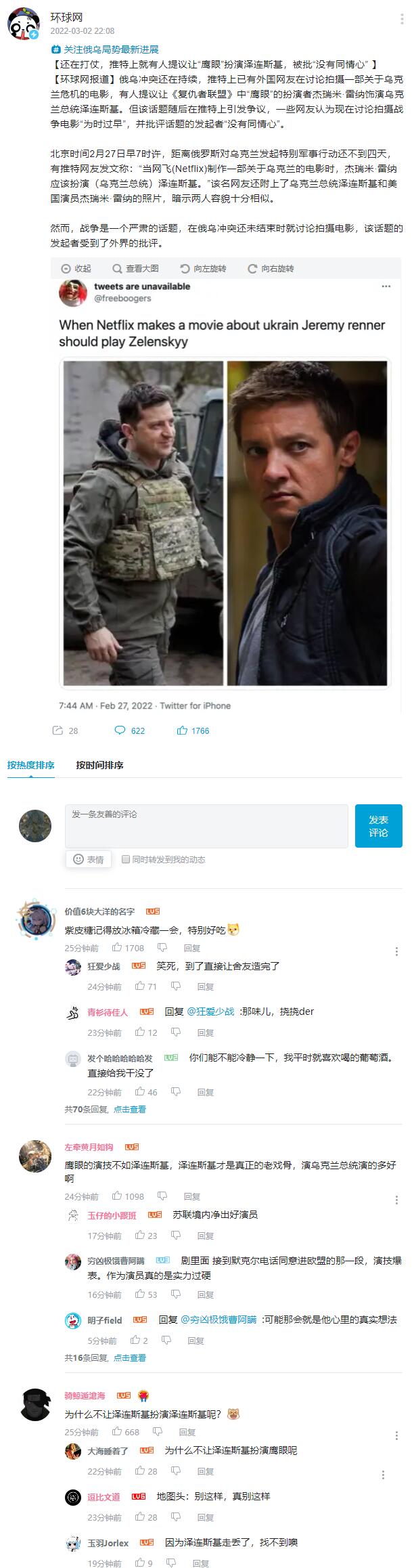 【还在打仗,推特上就有人提议让“鹰眼”扮演泽连斯基,被批“没有同情心” 】