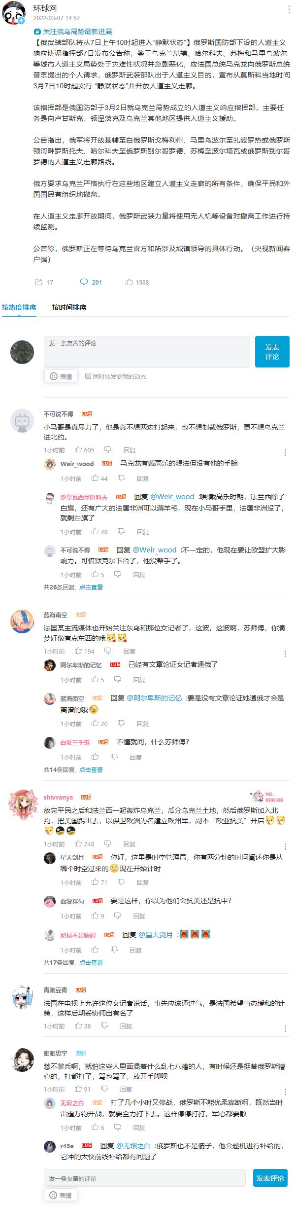 【俄武装部队将从7日上午10时起进入“静默状态”】俄罗斯国防部下设的人道主义响应协调指挥部7日发布公告称,鉴于乌克兰基辅、哈尔科夫、苏梅和马里乌波尔等城市人道主义局势处于灾难性状况并急剧恶化,应法国总统马克龙向俄罗斯总统普京提出的个人请求,俄罗斯武装部队出于人道主义目的,宣布从莫斯科当地时间3月7日10时起实行 “静默状态”并开放人道主义走廊。