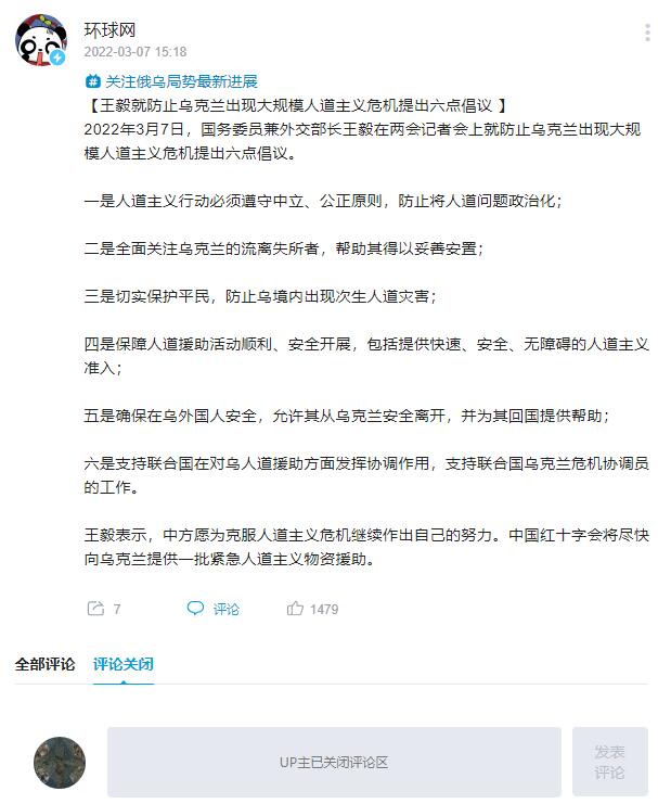 2022年3月7日,国务委员兼外交部长王毅在两会记者会上就防止乌克兰出现大规模人道主义危机提出六点倡议。