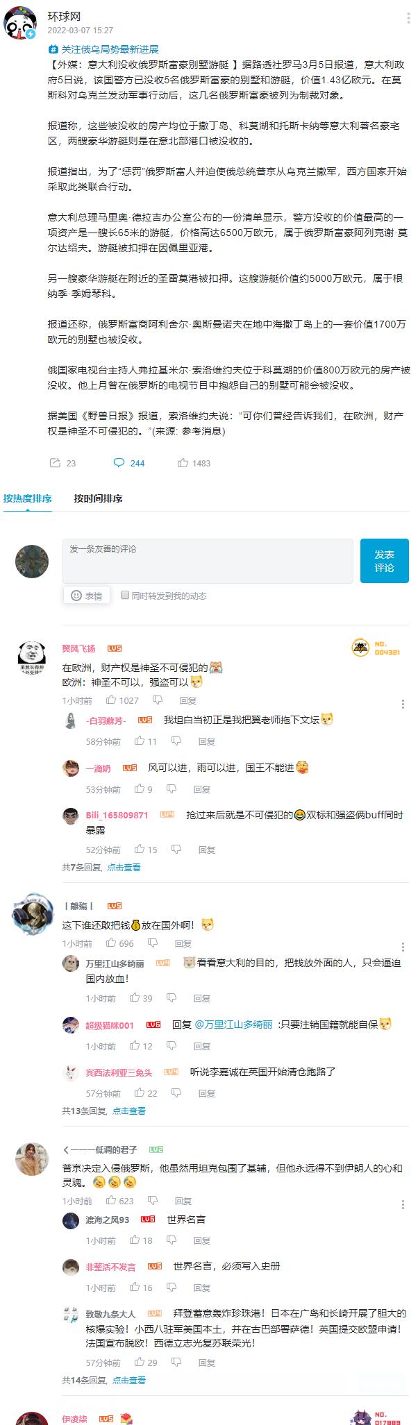 【外媒:意大利没收俄罗斯富豪别墅游艇 】据路透社罗马3月5日报道,意大利政府5日说,该国警方已没收5名俄罗斯富豪的别墅和游艇,价值1.43亿欧元。在莫斯科对乌克兰发动军事行动后,这几名俄罗斯富豪被列为制裁对象。