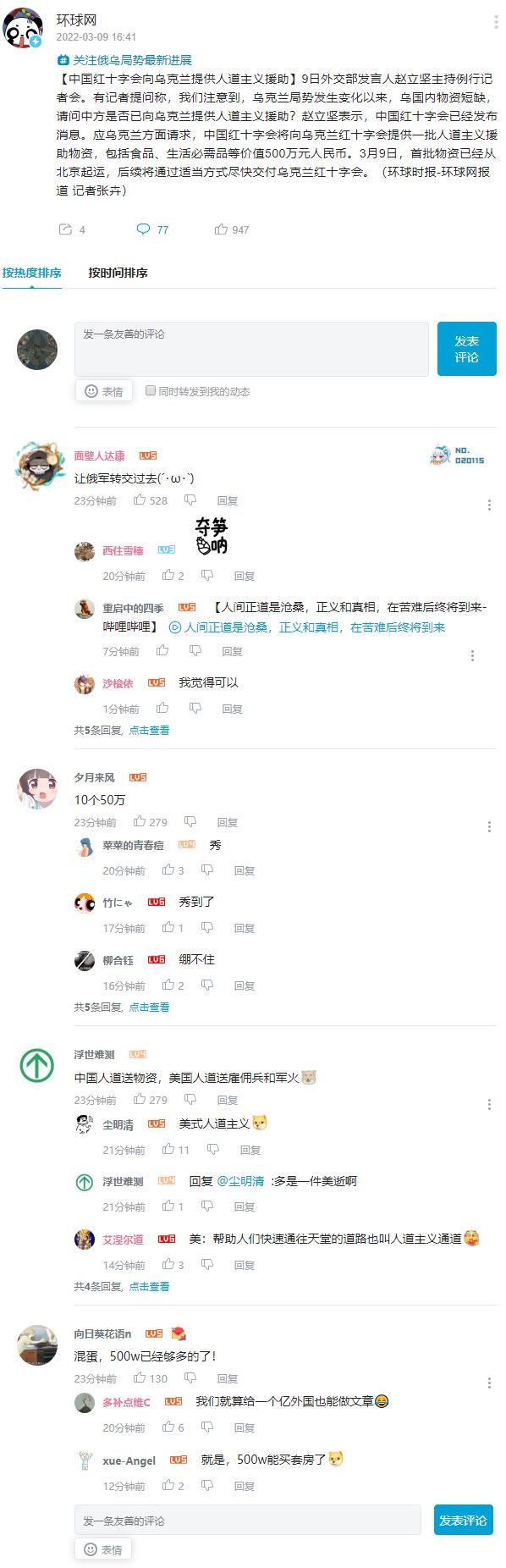 【中国红十字会向乌克兰提供人道主义援助】9日外交部发言人赵立坚主持例行记者会。有记者提问称,我们注意到,乌克兰局势发生变化以来,乌国内物资短缺,请问中方是否已向乌克兰提供人道主义援助?赵立坚表示,中国红十字会已经发布消息。应乌克兰方面请求,中国红十字会将向乌克兰红十字会提供一批人道主义援助物资,包括食品、生活必需品等价值500万元人民币。3月9日,首批物资已经从北京起运,后续将通过适当方式尽快交付乌克兰红十字会。(环球时报-环球网报道 记者张卉)