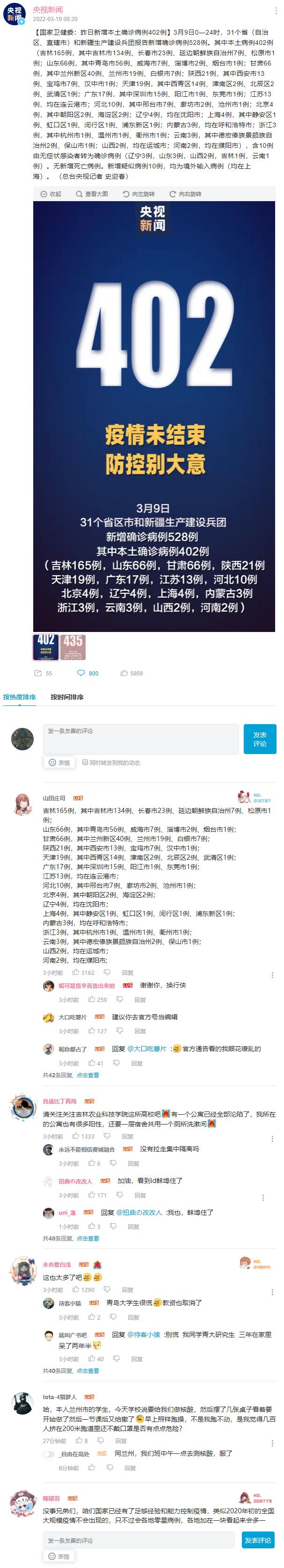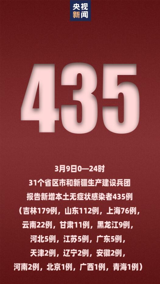 【国家卫健委:昨日新增本土确诊病例402例】3月9日0—24时,31个省(自治区、直辖市)和新疆生产建设兵团报告新增确诊病例528例。其中本土病例402例(吉林165例,其中吉林市134例、长春市23例、延边朝鲜族自治州7例、松原市1例;山东66例,其中青岛市56例、威海市7例、淄博市2例、烟台市1例;甘肃66例,其中兰州新区40例、兰州市19例、白银市7例;陕西21例,其中西安市13例、宝鸡市7例、汉中市1例;天津19例,其中西青区14例、津南区2例、北辰区2例、武清区1例;广东17例,其中深圳市15例、阳江市1例、东莞市1例;江苏13例,均在连云港市;河北10例,其中邢台市7例、廊坊市2例、沧州市1例;北京4例,其中朝阳区2例、海淀区2例;辽宁4例,均在沈阳市;上海4例,其中静安区1例、虹口区1例、闵行区1例、浦东新区1例;内蒙古3例,均在呼和浩特市;浙江3例,其中杭州市1例、温州市1例、衢州市1例;云南3例,其中德宏傣族景颇族自治州2例、保山市1例;山西2例,均在运城市;河南2例,均在濮阳市),含10例由无症状感染者转为确诊病例(辽宁3例,山东3例,山西2例,吉林1例,云南1例)。无新增死亡病例。新增疑似病例10例,均为境外输入病例(均在上海)。 (总台央视记者 史迎春)