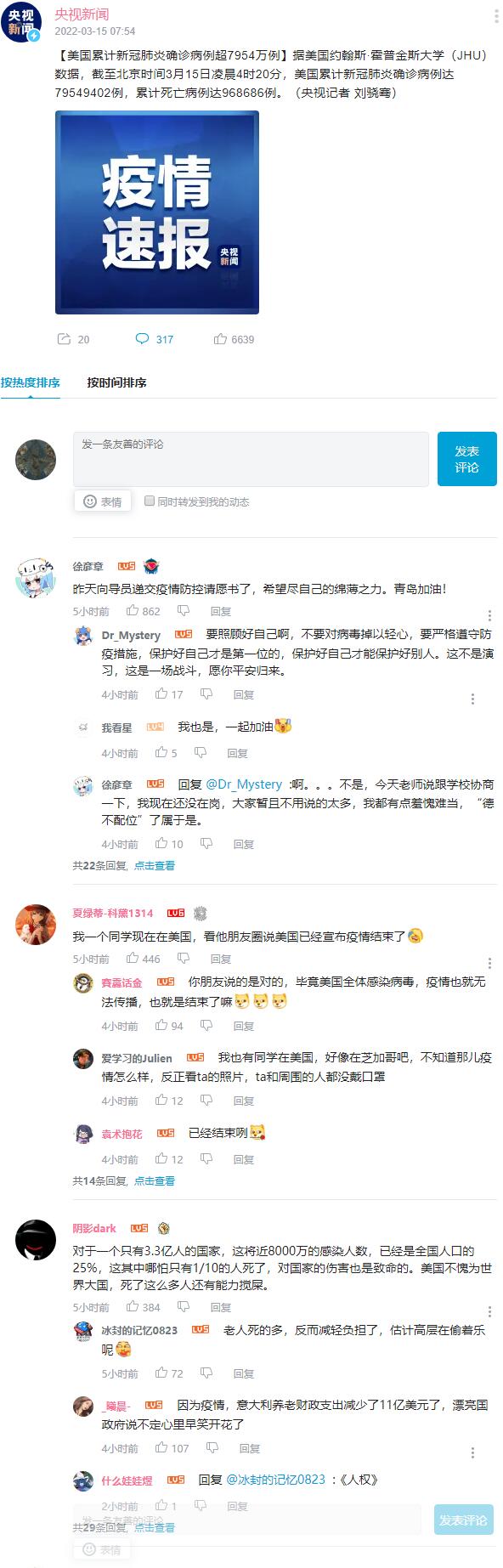 【美国累计新冠肺炎确诊病例超7954万例】据美国约翰斯·霍普金斯大学(JHU)数据,截至北京时间3月15日凌晨4时20分,美国累计新冠肺炎确诊病例达79549402例,累计死亡病例达968686例。(央视记者 刘骁骞)