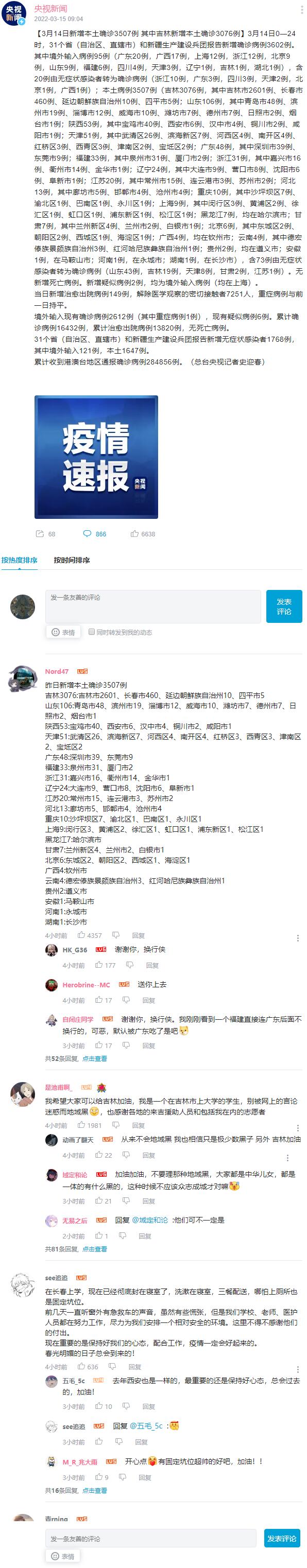 ★★★ 3月14日新增本土确诊3507例 其中吉林新增本土确诊3076例