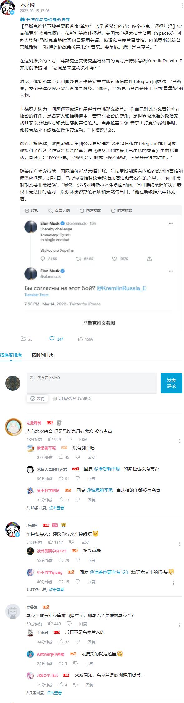 对此,俄罗斯车臣共和国领导人卡德罗夫在即时通信软件Telegram回应称,“马斯克,我倒是建议你不要与普京争胜负。”他称,马斯克与普京是属于不同“重量级”的人物。