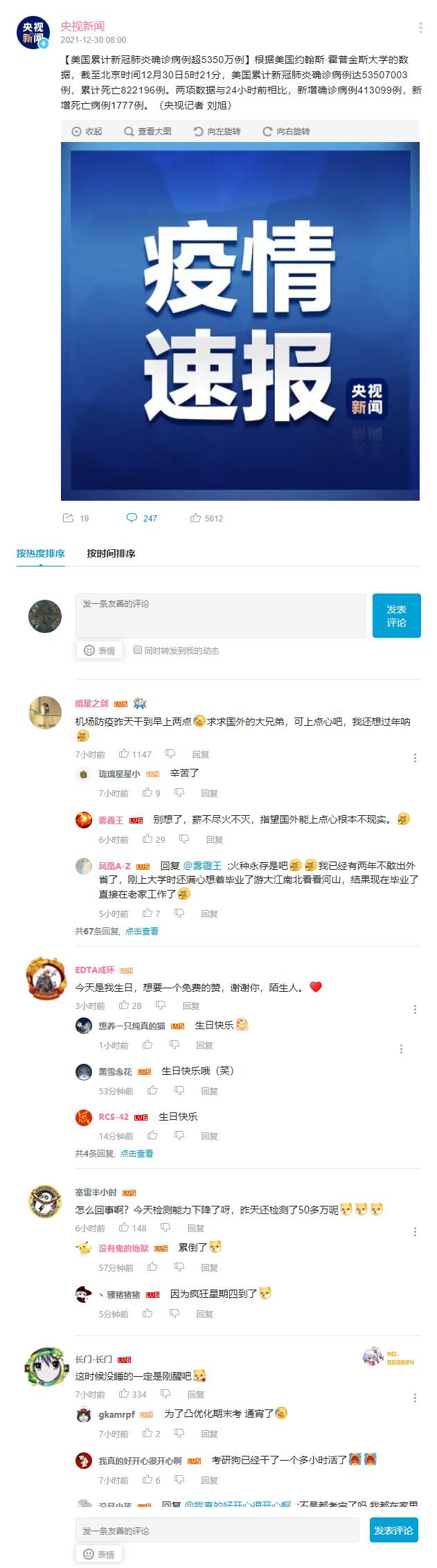 【美国累计新冠肺炎确诊病例超5350万例】根据美国约翰斯·霍普金斯大学的数据,截至北京时间12月30日5时21分,美国累计新冠肺炎确诊病例达53507003例,累计死亡822196例。两项数据与24小时前相比,新增确诊病例413099例,新增死亡病例1777例。(央视记者 刘旭)