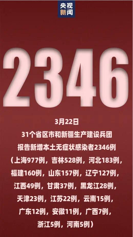 【国家卫健委:昨日新增本土确诊病例2591例】3月22日0—24时,31个省(自治区、直辖市)和新疆生产建设兵团报告新增确诊病例2667例。其中境外输入病例76例(广西12例,上海10例,浙江10例,湖南10例,广东8例,四川7例,福建6例,河南6例,天津4例,山西2例,北京1例),含21例由无症状感染者转为确诊病例(浙江9例,湖南8例,四川4例);本土病例2591例(吉林2320例,其中长春市1979例、吉林市331例、四平市9例、延边朝鲜族自治州1例;福建110例,其中泉州市100例、莆田市6例、漳州市4例;辽宁36例,其中营口市13例、大连市12例、沈阳市7例、辽阳市4例;天津24例,其中西青区13例、河北区3例、红桥区3例、滨海新区2例、河东区1例、东丽区1例、北辰区1例;山东24例,其中滨州市16例、烟台市4例、济南市1例、青岛市1例、淄博市1例、威海市1例;广东15例,其中深圳市13例、东莞市1例、中山市1例;黑龙江13例,均在哈尔滨市;河北9例,其中廊坊市7例、石家庄市1例、唐山市1例;江西9例,均在南昌市;河南6例,其中周口市4例、郑州市1例、开封市1例;甘肃6例,其中兰州市5例、陇南市1例;北京4例,其中朝阳区3例、东城区1例;上海4例,其中徐汇区2例、嘉定区2例;陕西3例,其中宝鸡市2例、西安市1例;江苏2例,均在盐城市;湖南2例,均在长沙市;云南2例,均在德宏傣族景颇族自治州;浙江1例,在湖州市;重庆1例,在沙坪坝区),含94例由无症状感染者转为确诊病例(吉林73例,辽宁13例,福建3例,山东3例,浙江1例,广东1例)。无新增死亡病例。新增疑似病例3例,均为境外输入病例(均在上海)。详情↓↓(总台央视记者 史迎春)