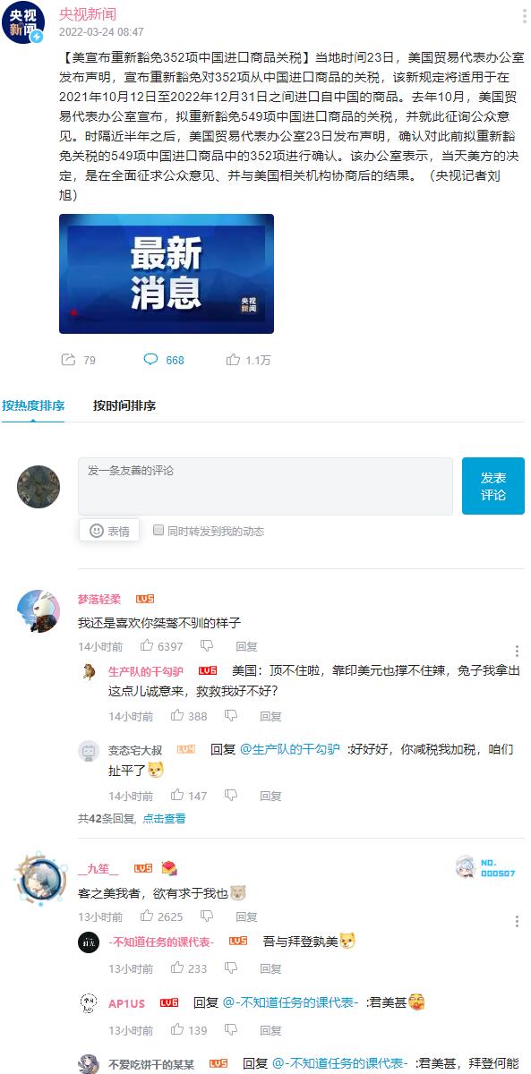 【美宣布重新豁免352项中国进口商品关税】当地时间23日,美国贸易代表办公室发布声明,宣布重新豁免对352项从中国进口商品的关税,该新规定将适用于在2021年10月12日至2022年12月31日之间进口自中国的商品。去年10月,美国贸易代表办公室宣布,拟重新豁免549项中国进口商品的关税,并就此征询公众意见。时隔近半年之后,美国贸易代表办公室23日发布声明,确认对此前拟重新豁免关税的549项中国进口商品中的352项进行确认。该办公室表示,当天美方的决定,是在全面征求公众意见、并与美国相关机构协商后的结果。(央视记者刘旭)