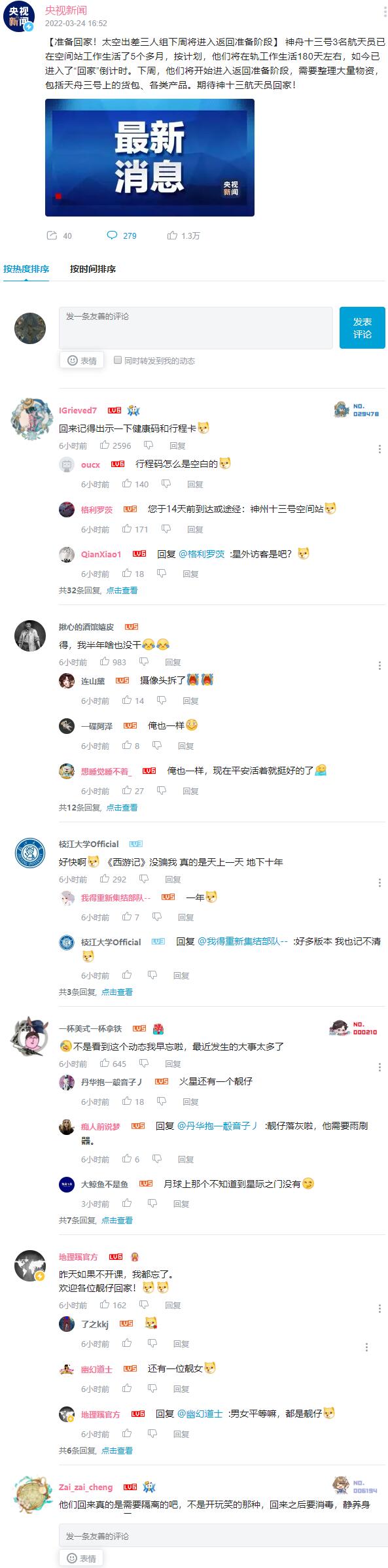 【准备回家!太空出差三人组下周将进入返回准备阶段】 神舟十三号3名航天员已在空间站工作生活了5个多月,按计划,他们将在轨工作生活180天左右,如今已进入了“回家”倒计时。下周,他们将开始进入返回准备阶段,需要整理大量物资,包括天舟三号上的货包、各类产品。期待神十三航天员回家!