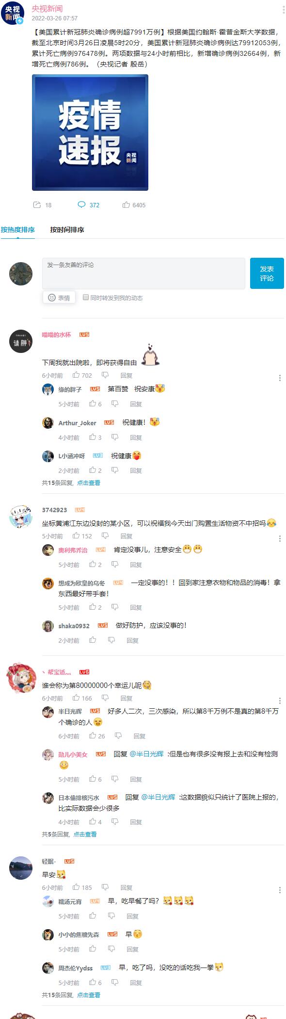 【美国累计新冠肺炎确诊病例超7991万例】根据美国约翰斯·霍普金斯大学数据,截至北京时间3月26日凌晨5时20分,美国累计新冠肺炎确诊病例达79912053例,累计死亡病例976478例。两项数据与24小时前相比,新增确诊病例32664例,新增死亡病例786例。(央视记者 殷岳)