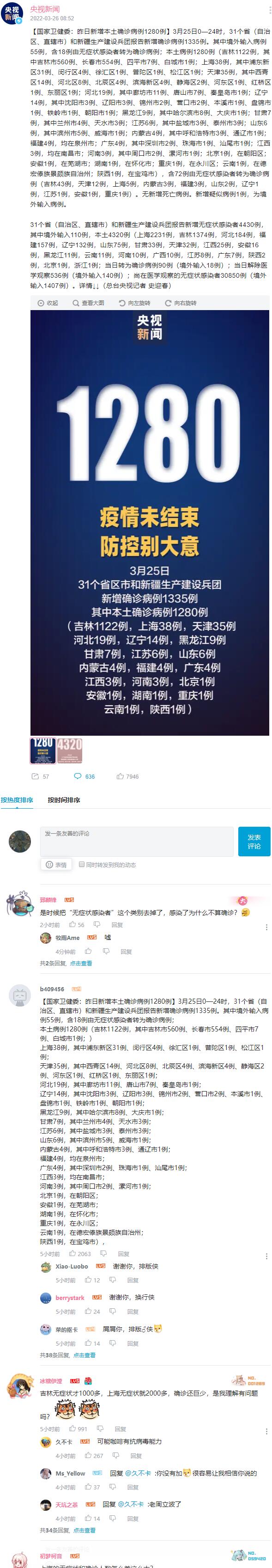 【国家卫健委:昨日新增本土确诊病例1280例】3月25日0—24时,31个省(自治区、直辖市)和新疆生产建设兵团报告新增确诊病例1335例。其中境外输入病例55例,含18例由无症状感染者转为确诊病例;本土病例1280例(吉林1122例,其中吉林市560例、长春市554例、四平市7例、白城市1例;上海38例,其中浦东新区31例、闵行区4例、徐汇区1例、普陀区1例、松江区1例;天津35例,其中西青区14例、河北区8例、北辰区4例、滨海新区4例、静海区2例、河东区1例、红桥区1例、东丽区1例;河北19例,其中廊坊市11例、唐山市7例、秦皇岛市1例;辽宁14例,其中沈阳市3例、辽阳市3例、锦州市2例、营口市2例、本溪市1例、盘锦市1例、铁岭市1例、朝阳市1例;黑龙江9例,其中哈尔滨市8例、大庆市1例;甘肃7例,其中兰州市4例、天水市3例;江苏6例,其中盐城市3例、泰州市3例;山东6例,其中滨州市5例、威海市1例;内蒙古4例,其中呼和浩特市3例、通辽市1例;福建4例,均在泉州市;广东4例,其中深圳市2例、珠海市1例、汕尾市1例;江西3例,均在南昌市;河南3例,其中周口市2例、漯河市1例;北京1例,在朝阳区;安徽1例,在芜湖市;湖南1例,在怀化市;重庆1例,在永川区;云南1例,在德宏傣族景颇族自治州;陕西1例,在宝鸡市),含72例由无症状感染者转为确诊病例(吉林43例,天津12例,上海5例,内蒙古3例,福建3例,山东2例,辽宁1例,江苏1例,安徽1例,重庆1例)。无新增死亡病例。新增疑似病例1例,为境外输入病例。
