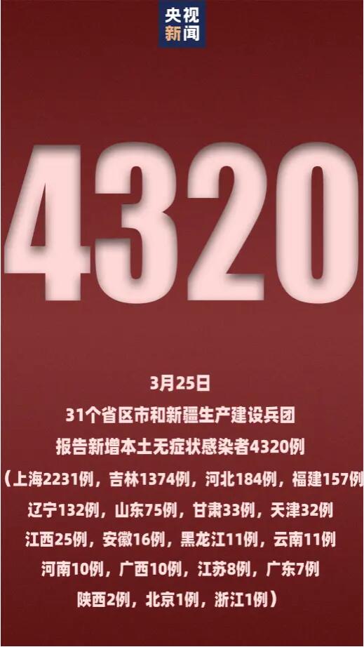 31个省(自治区、直辖市)和新疆生产建设兵团报告新增无症状感染者4430例,其中境外输入110例,本土4320例(上海2231例,吉林1374例,河北184例,福建157例,辽宁132例,山东75例,甘肃33例,天津32例,江西25例,安徽16例,黑龙江11例,云南11例,河南10例,广西10例,江苏8例,广东7例,陕西2例,北京1例,浙江1例;当日转为确诊病例90例(境外输入18例);当日解除医学观察536例(境外输入140例);尚在医学观察的无症状感染者30850例(境外输入1407例)。详情↓↓(总台央视记者 史迎春)