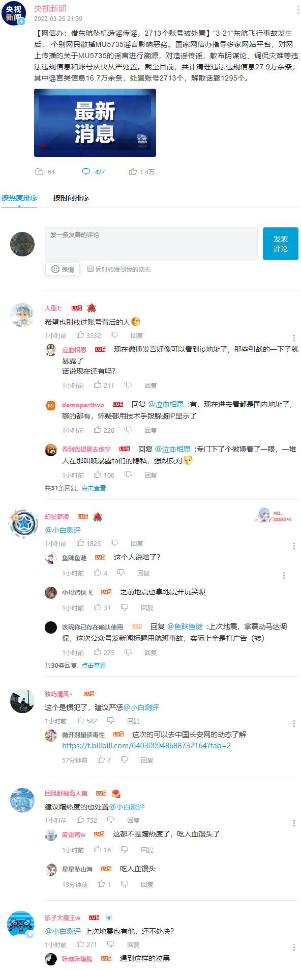 ★★★ 网信办:借东航坠机造谣传谣,2713个账号被处置